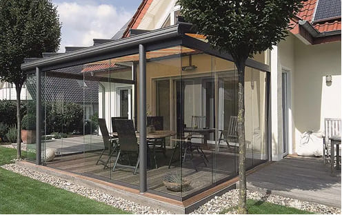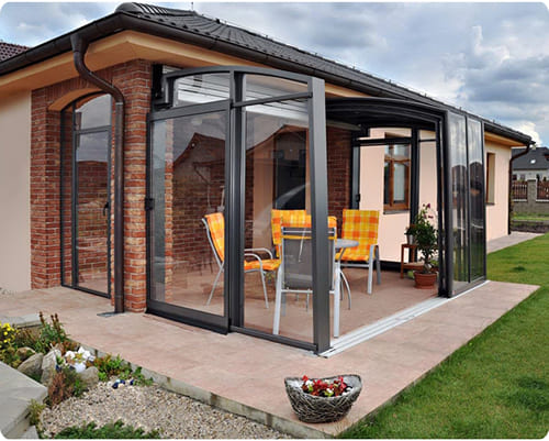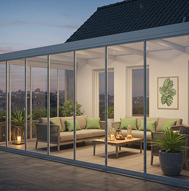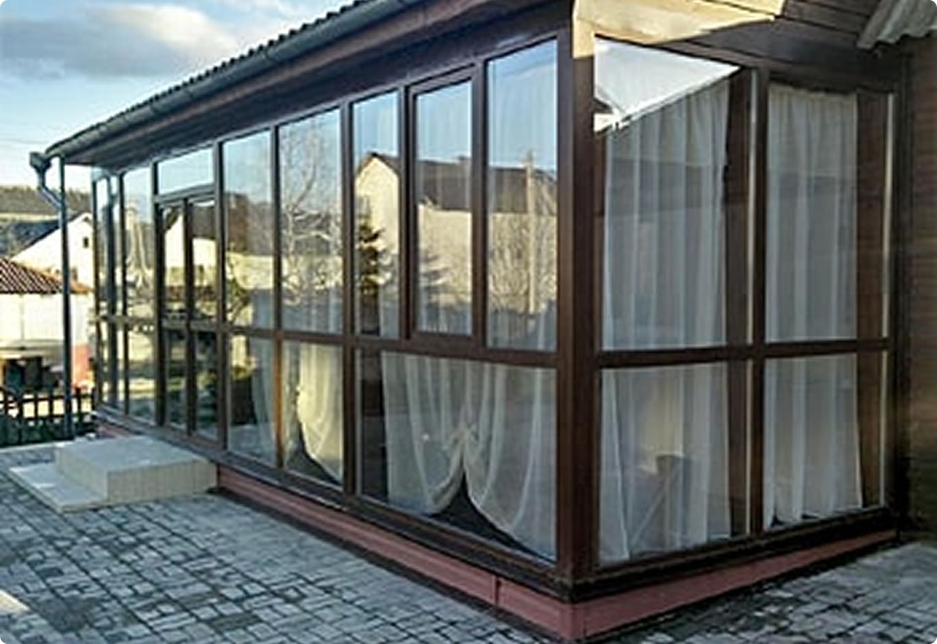 Теплое остекление: На основе профиля ПВХ или дерево-алюминия с многокамерными стеклопакетами для всесезонного использования.